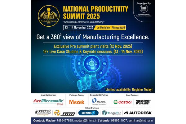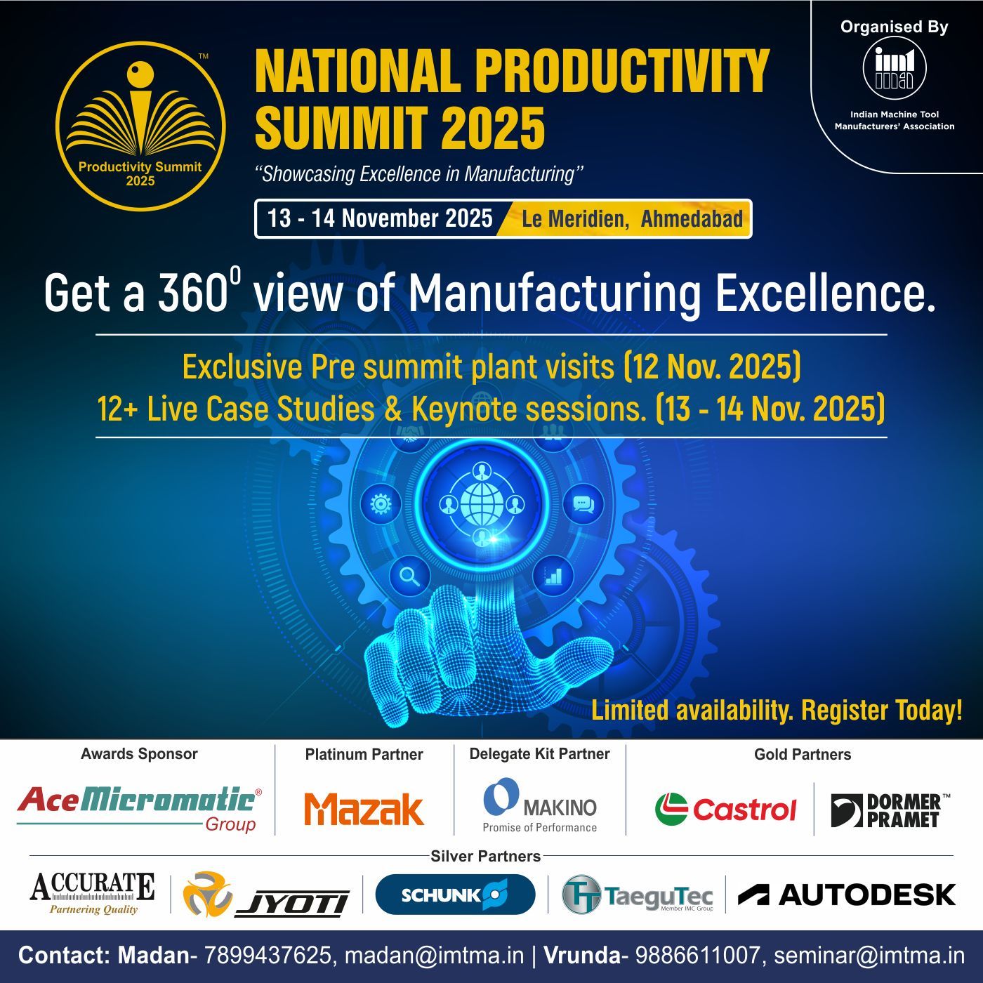 Indian Machine Tool Manufacturers’ Association (IMTMA) is organising the 19th edition of National Productivity Summit (NPS 2025) at Ahmedabad on November 13-14, 2025. The IMTMA - ACE MICROMATIC Productivity Championship Awards, sponsored by AceMicromatic Group, will be conferred to recognise outstanding productivity achievements across the Indian manufacturing sector.