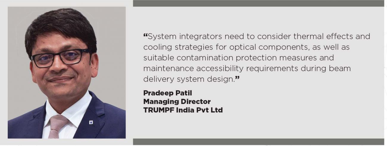 Pradeep Patil, Managing Director, TRUMPF India, says, “System integrators need to consider thermal effects and cooling strategies for optical components, as well as suitable contamination protection measures and maintenance accessibility requirements during beam delivery system design. The integration challenge involves maintaining consistent beam quality during robotic applications where the laser head navigates complex three-dimensional paths and operates at different working distances and angles.”