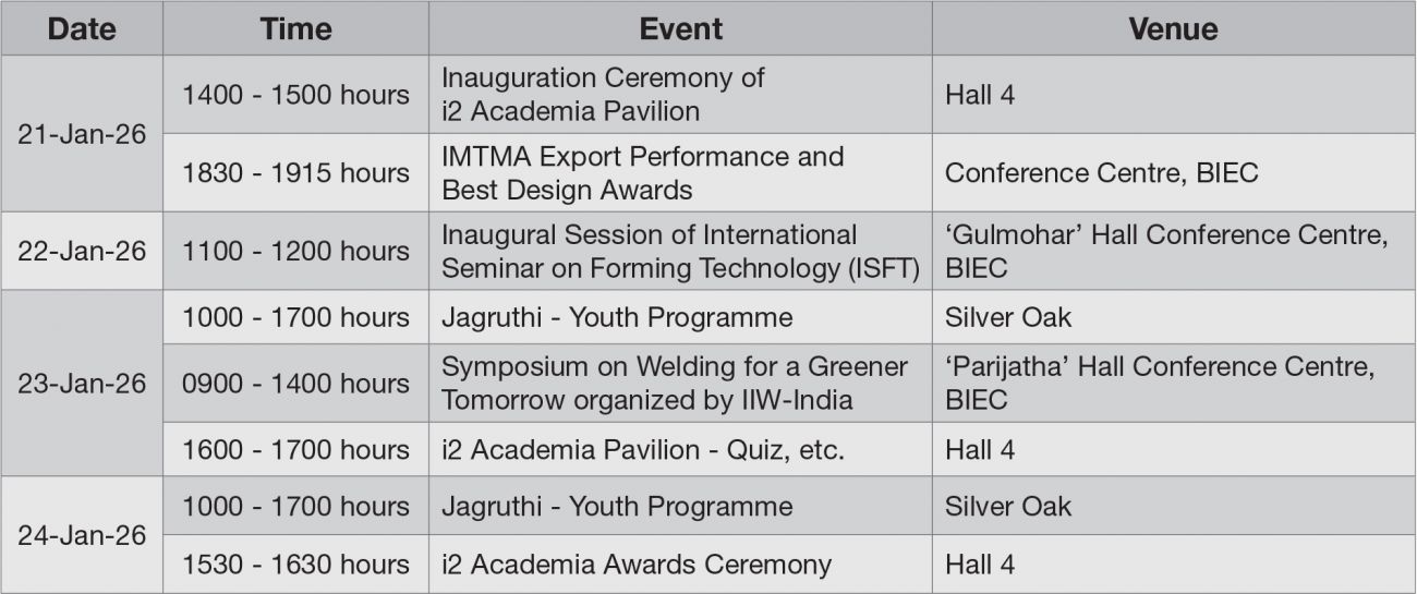 To bridge the gap between academia and industry, the i2 Academia Square will unite premier institutions from across India to showcase academic research and development relevant to manufacturing industries. For young engineering professionals, the Jagruti-IMTMA Youth Programme will provide a platform to engage with industry leaders and launch their careers. The Manufacturing Technology Quiz Contest will also engage young engineers by challenging their knowledge and sparking curiosity.
