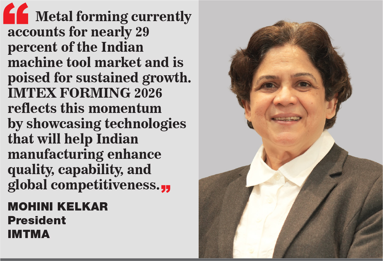 Highlighting the importance of the event, Mohini Kelkar, President, IMTMA, notes that metal forming currently accounts for nearly 29 percent of the Indian machine tool market and is poised for sustained growth. “IMTEX FORMING 2026 reflects this momentum by showcasing technologies that will help Indian manufacturing enhance quality, capability, and global competitiveness,” she says.